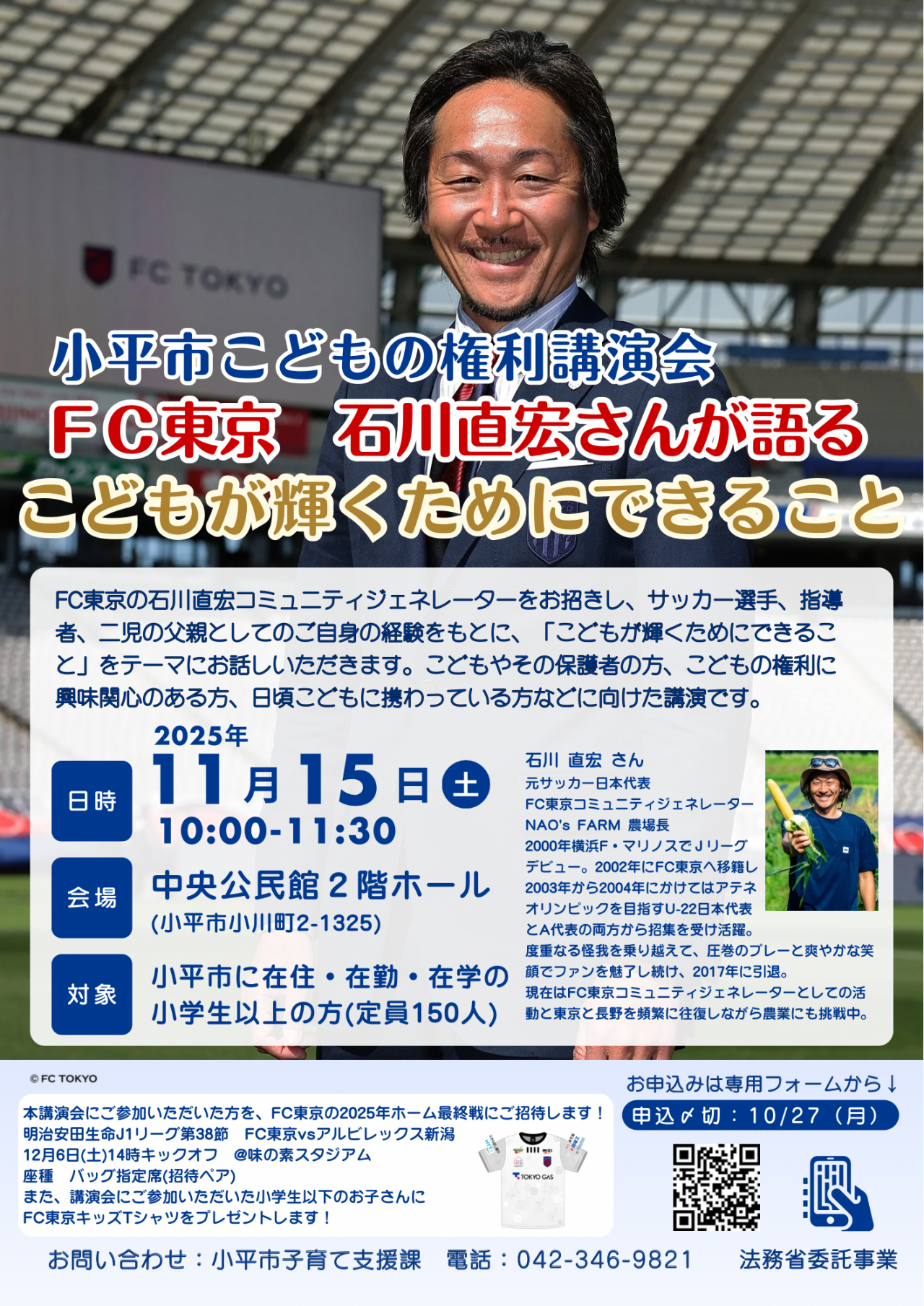FC東京の石川直宏コミュニティジェネレーターをお招きし、サッカー選手、指導者、二児の父親としてのご自身の経験をもとに、「こどもが輝くためにできること」をテーマにお話しいただきます。こどもやその保護者の方、こどもの権利に興味関心のある方、日頃こどもに携わっている方などに向けた講演です。