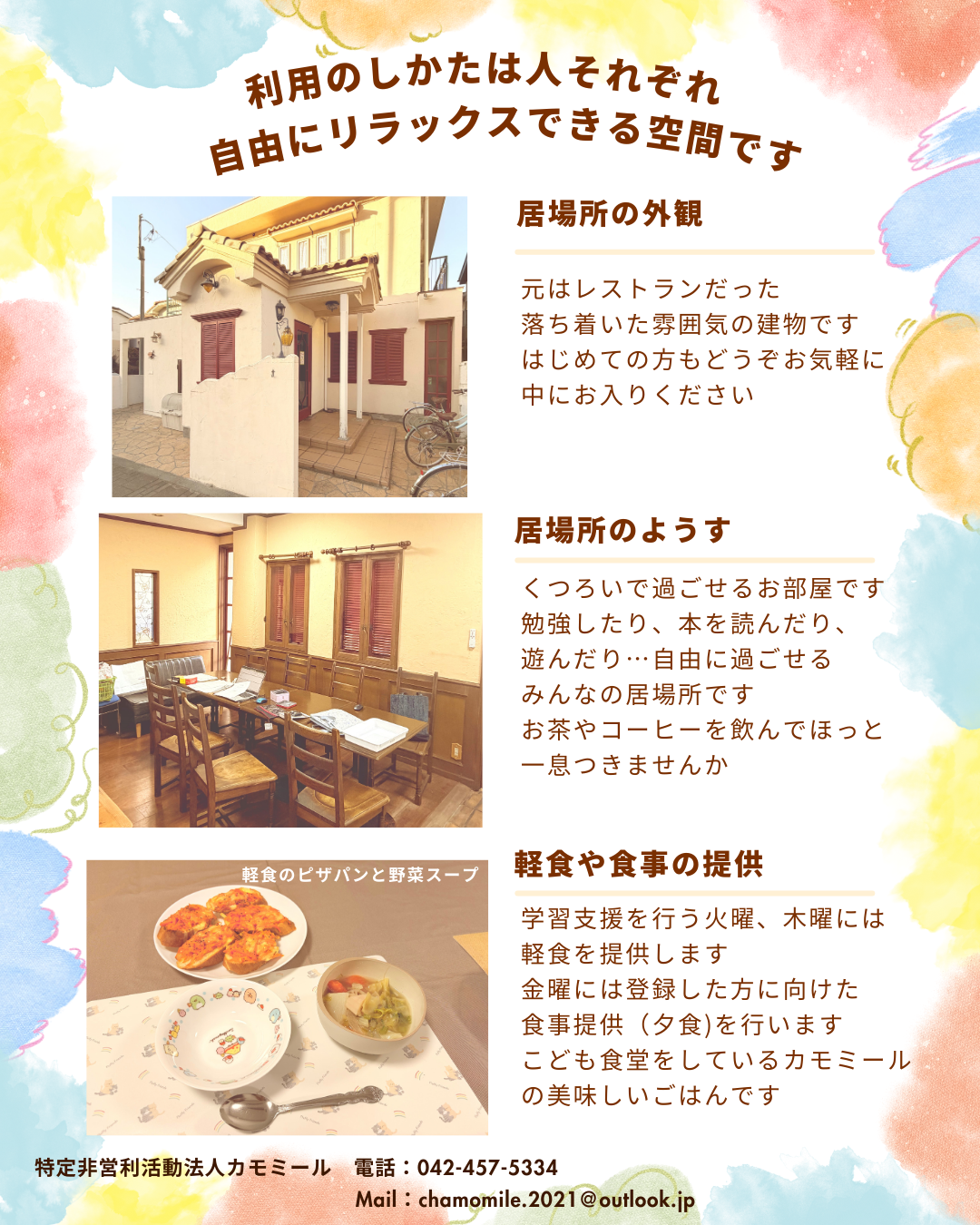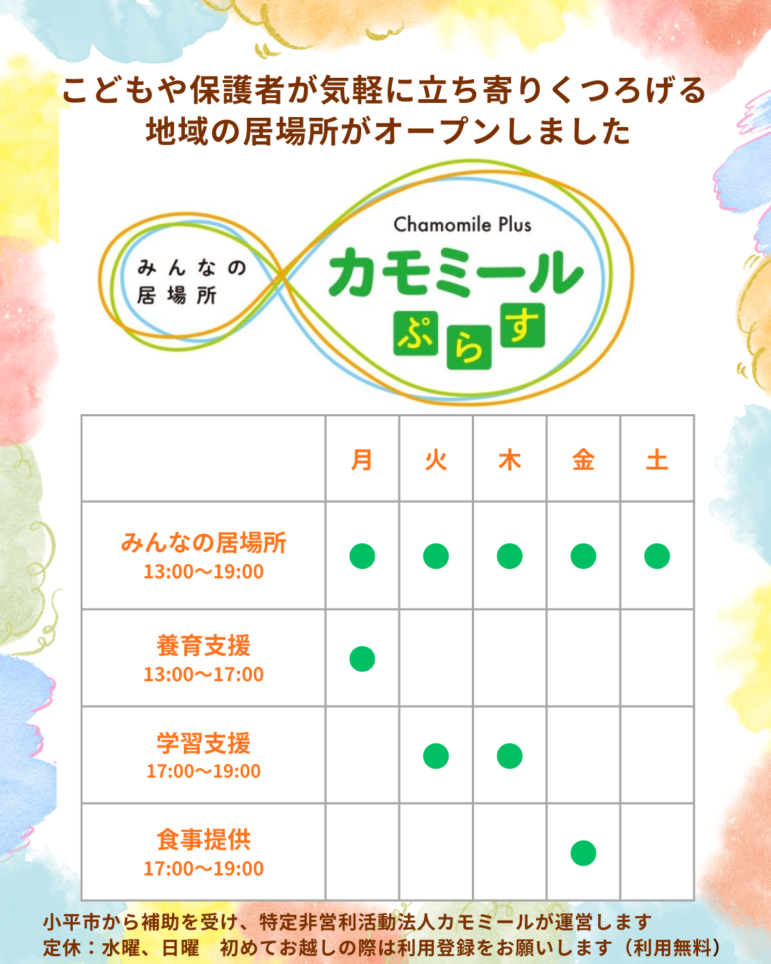 みんなの居場所 カモミールぷらすは、小平市から補助を受けて特定非営利活動法人カモミールが運営しています。