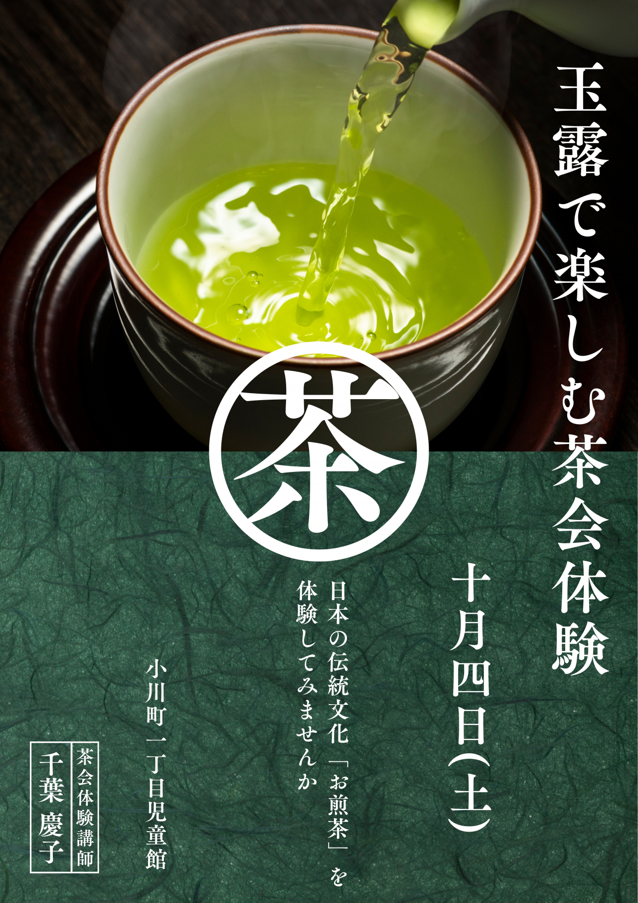 香り高い「玉露」を使った立礼式(椅子に座って行うお茶会)でのワークショップです。